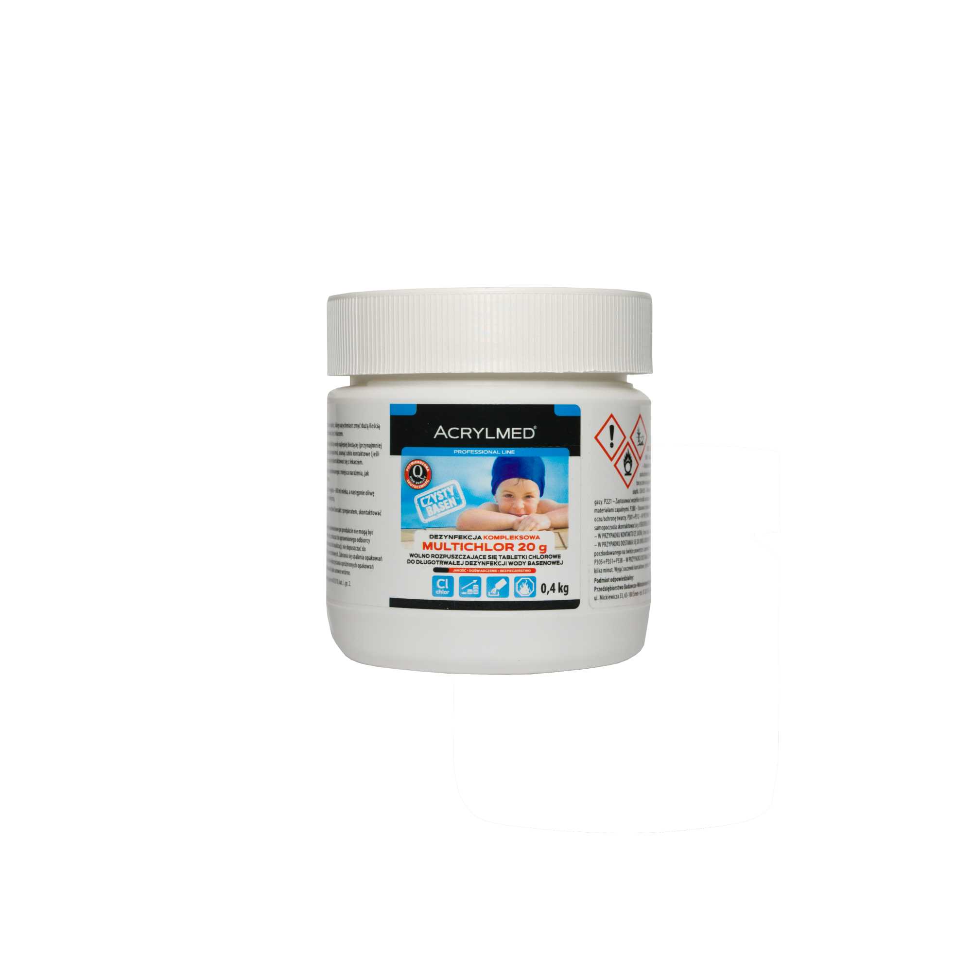 Acrylmed Multichlor 200 G to tabletki o działaniu bakteriobójczym, przeznaczone do długotrwałej dezynfekcji wody w basenie. Tabletki skutecznie zwalczają bakterie, wirusy i inne mikroorganizmy, zapewniając czystą i higieniczną wodę do kąpieli.