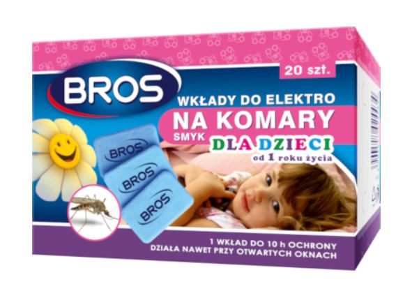 BROS wkłady do ELEKTRO na komary, służą do stosowania za pomocą elektrofumigatora, służą do zwalczania komarów, zapewniając ochronę w pomieszczeniach. Wkłady SMYK są przygotowane specjalnie do pomieszczeń w których przebywają dzieci.