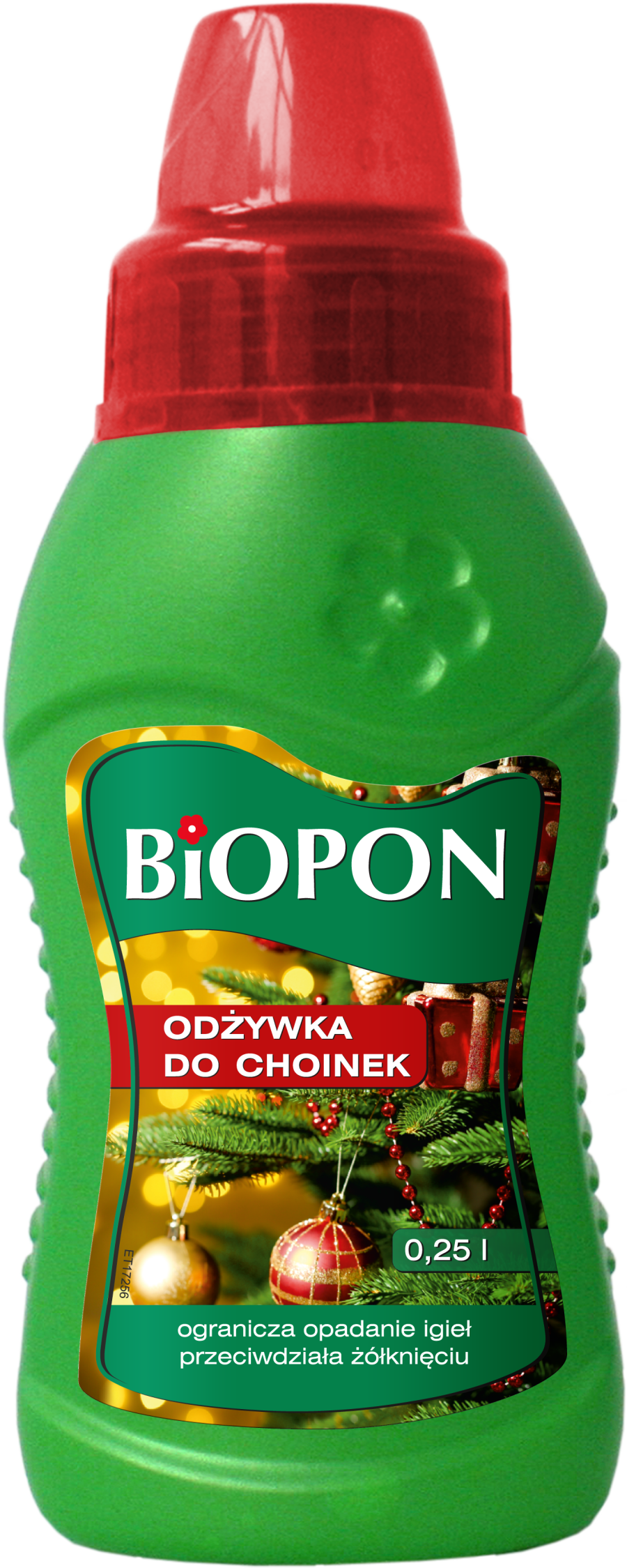 Odżywka do żywych choinek ciętych Biopon została przygotowana z myślą o przedłużeniu okresu trwania żywych choinek które zostały przyniesione do domów na okres świąteczny. Odżywka posiada specjalnie przygotowany skład, który powoduje, że wszystkie gałązki choinki są lepiej nawodnione, dzięki czemu, zostaje ograniczone żółknięcie a także opadanie igieł drzewka.