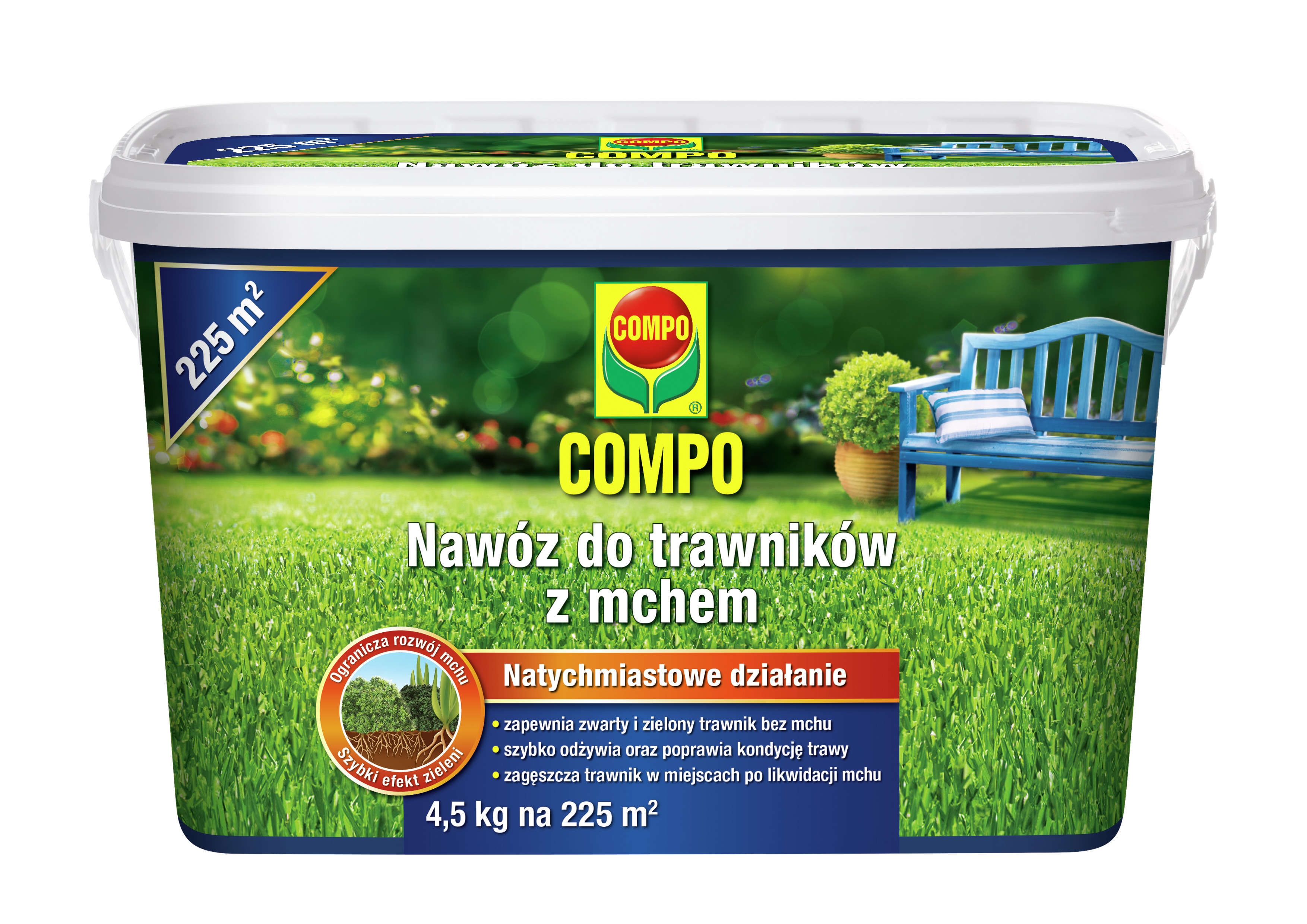 COMPO Nawóz do trawników z mchem regeneruje zaniedbany trawnik. Dzięki zawartości żelaza skutecznie eliminuje mech z trawnika i zapobiega jego dalszemu rozwojowi. Produkt wzbogacony jest o potas oraz mikroelementy, które korzystnie wpływają na wzrost i rozwój darni. Staje się ona silniejsza i gęstsza.