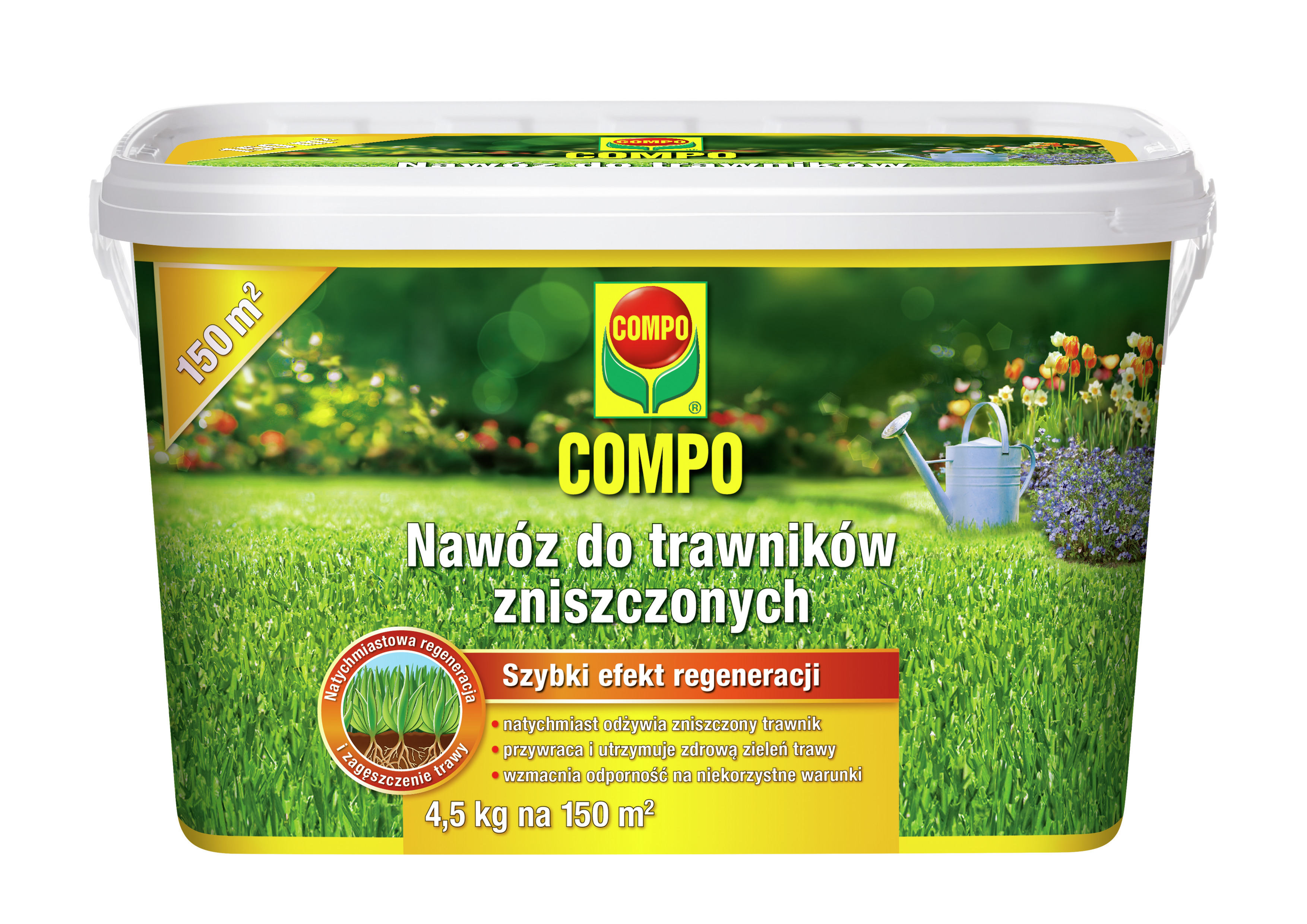 COMPO Nawóz do trawników zniszczonych doskonale nadaje się do szybkiej renowacji trawnika, który ucierpiał przez niekorzystne warunki atmosferyczne lub błędy w pielęgnacji. Jest także idealnym wyborem do wzbogacenia w składniki odżywcze trawników rosnących na ubogich glebach.