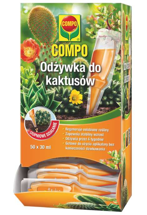 COMPO Odżywka do kaktusów przygotowana jest specjalnie do regeneracji kaktusów, sukulentów i gruboszy. Skutecznie wzmacnia osłabione rośliny, odżywia je, poprawiając ich wygląd i odporność. Produkt w postaci wygodnych, gotowych do użycia aplikatorów. Jedna dawka regeneruje rośliny przez 4 tygodnie.