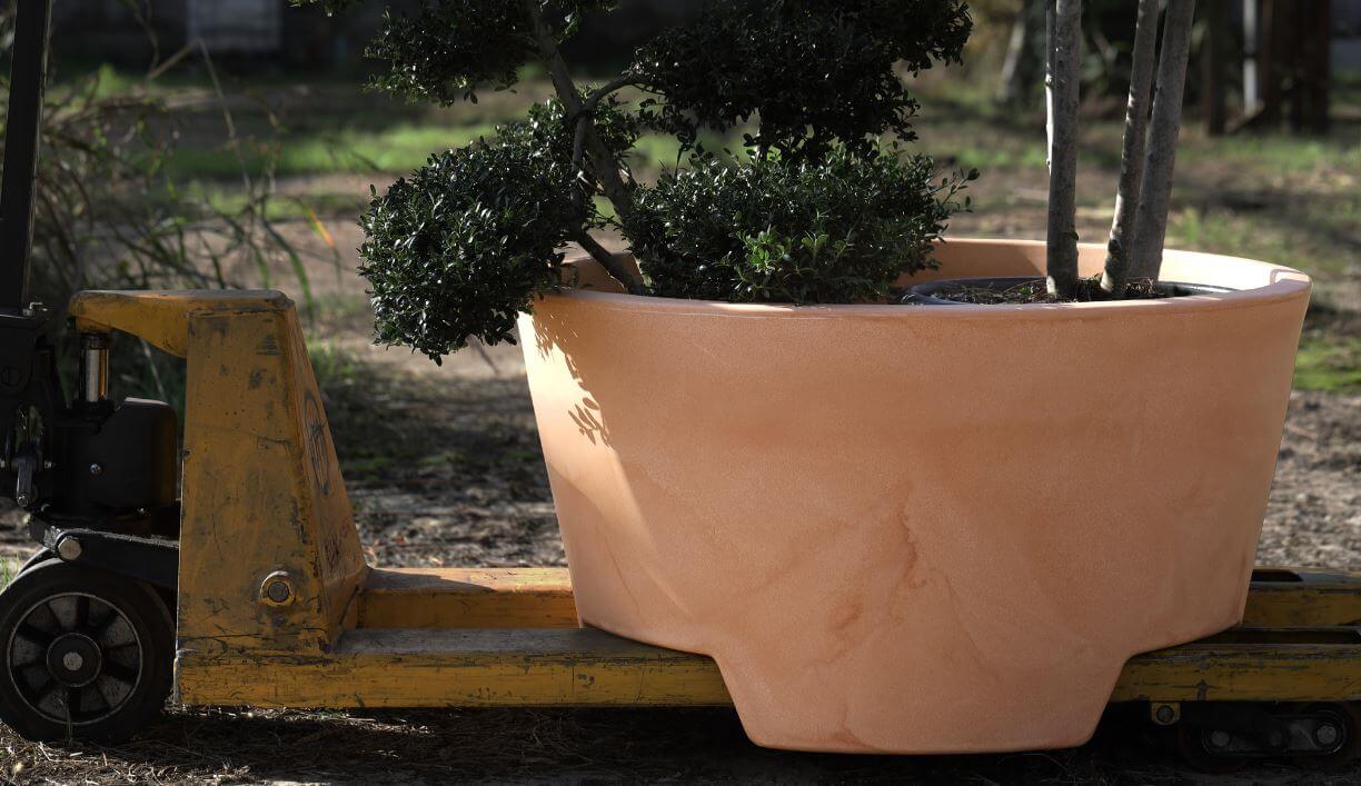 Dno donicy posiada poprzeczne prowadnice do łatwego chwytu ręcznym wózkiem paletowym, co ułatwia przemieszczanie donic i zmianę aranżacji.