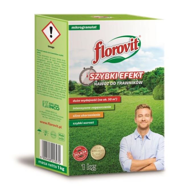 Nawóz Florovit SZYBKI EFEKT do trawników, został stworzony specjalnie z myślą o zasilaniu trawy we wszystkie niezbędne substancje odżywcze. Nawóz został odpowiednio zbilansowany, dzięki temu pobudza trawnik do szybkiego wzrostu. Nawóz gwarantuje piękny i intensywnie zagęszczony trawnik. SZYBKI EFEKT może być stosowany do wszelkiego rodzaju trawników, a najlepiej sprawdzi się na tych obszarach, które są intensywnie użytkowane.