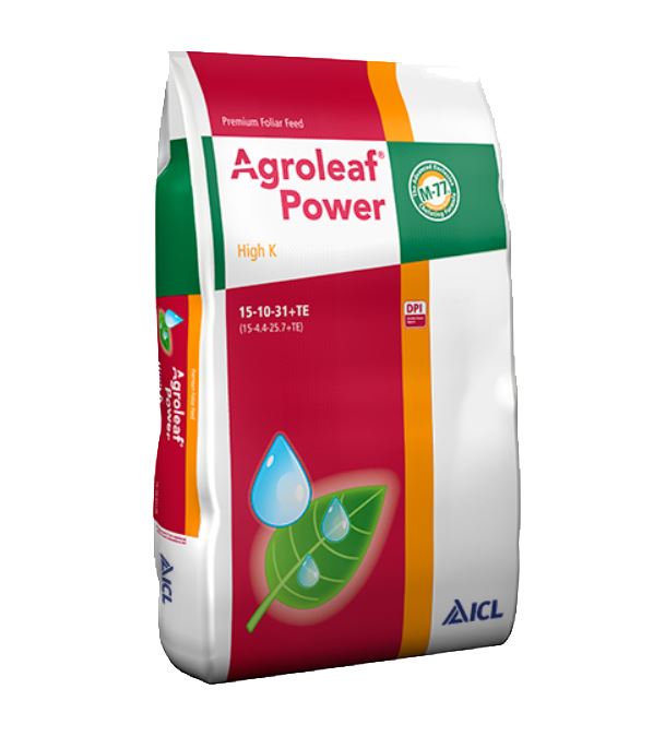 ICL Agroleaf Power High K - to nawóz potasowy który poprawia mrozoodporność, a także odporność na choroby oraz niekorzystne warunki środowiska (np. suszę). Nawóz ten jest stosowany w fazie owocowania, przyśpiesza dojrzewanie owoców a także poprawia ich wybarwienie. Nawóz dodatkowo podnosi zawartość cukrów.