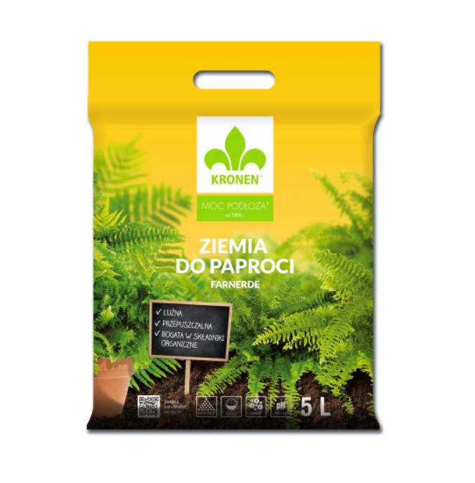 KRONEN Ziemia do paproci, jest specjalnie przygotowanym podłożem które służy do sadzenia i przesadzania paproci a także innych roślin które wymagają luźnego, przepuszczalnego i bogatego w składniki odżywcze podłoża.