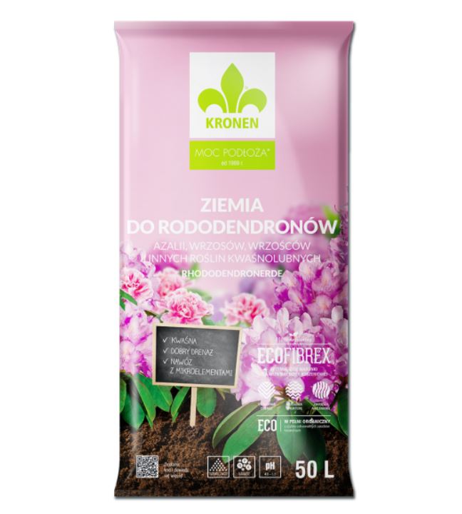 KRONEN® Ziemia do rododendronów i wrzosów to specjalistyczne podłoże przeznaczone do sadzenia i przesadzania roślin kwaśnolubnych, które preferują niskie pH gleby. Jest idealna dla takich roślin jak rododendrony, azalie, wrzosy, borówki, paprocie ogrodowe, niebieskie hortensje oraz karłowate krzewy iglaste.