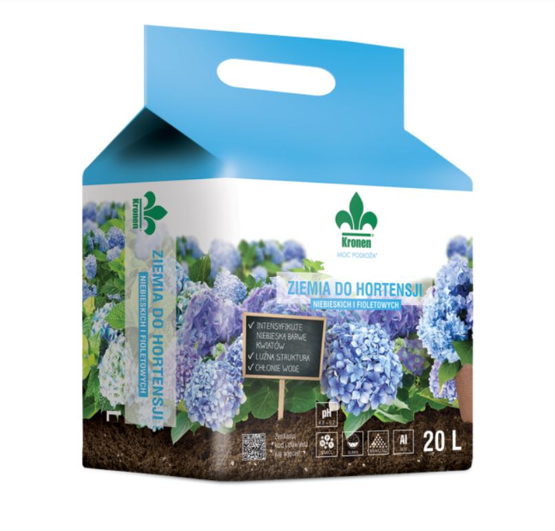 KRONEN Ziemia do hortensji niebieskich i fioletowych jest bogata w próchnicę, żyzne podłoże. Stworzona w oparciu o frakcje torfu wysokiego z dodatkiem iłu głębinowego, nawilżacza i glinu.