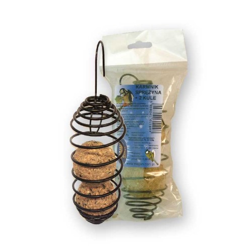 Karmnik w postaci sprężyny z dwoma kulami tłuszczowymi, idealny do dokarmiania ptaków zimą.