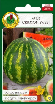 Crimson Sweet to odmiana średnio wczesna, wyróżniająca się bardzo wysoką plennością. Tworzy duże, owalne owoce o masie około 8 kg. Skórka ma kolor jasnozielony z wyraźnymi, ciemniejszymi pręgami. Miąższ jest intensywnie czerwony, słodki, soczysty i bardzo aromatyczny. Odmiana cechuje się także dobrą odpornością na choroby.