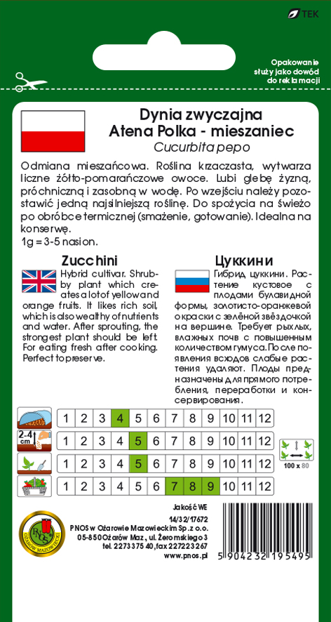 PNOS Cukinia Atena Polka F1 to odmiana, która jest pierwszą polską odmianą mieszaną cukinii. Odmiana ta ma bardzo duży plon.