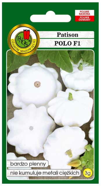 PNOS Dynia zwyczajna Patison Polo to odmiana, której kształt przypomina dysk z wrębami. Dojrzałe owoce są kremowobiałe, a miąższ jest kremowy.