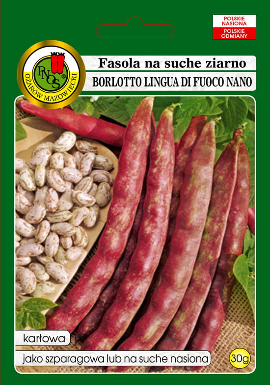 PNOS Fasola na suche nasiona Borlotto Lingua di Fuoco Nano to odmiana, która może być hodowana jak fasola szparagowa oraz jako fasola na nasiona suche. Fasola ta ma szerokie, bezwłókniste i soczyste strąki.