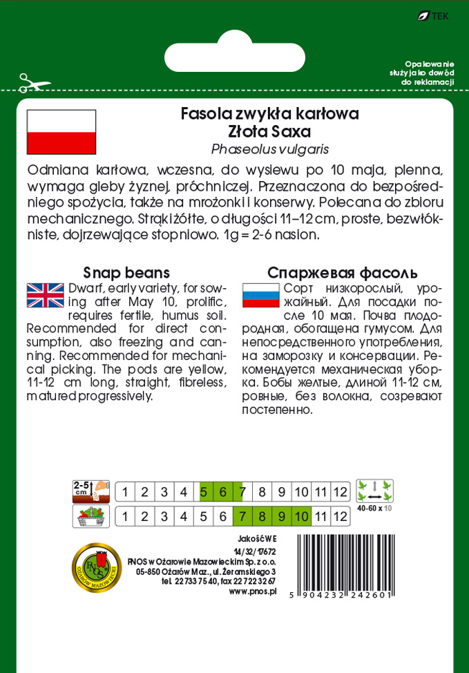 PNOS Fasola szparagowa Złota Saxa żółta to odmiana, której rośliny są karłowate i rosną na wysokość ok. 35-45 cm, a strąki mają długość ok. 11-12 cm i dojrzewają stopniowo. Nasiona Odmiany Złota Saxa mają kolor biały.