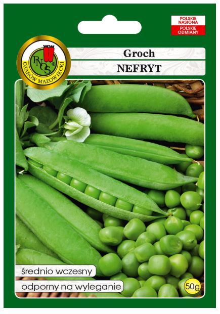 PNOS Groch łuskowy Nefryt to odmiana, która rośnie na wysokość ok. 55-65 cm, nie pokłada się po ziemi. Strąki dojrzewają równocześnie, dzięki czemu możliwy jest zbiór jednorazowy. Strąki mają ok. 8,5 cm długości, a w jednym strąku jest 7-8 nasion.