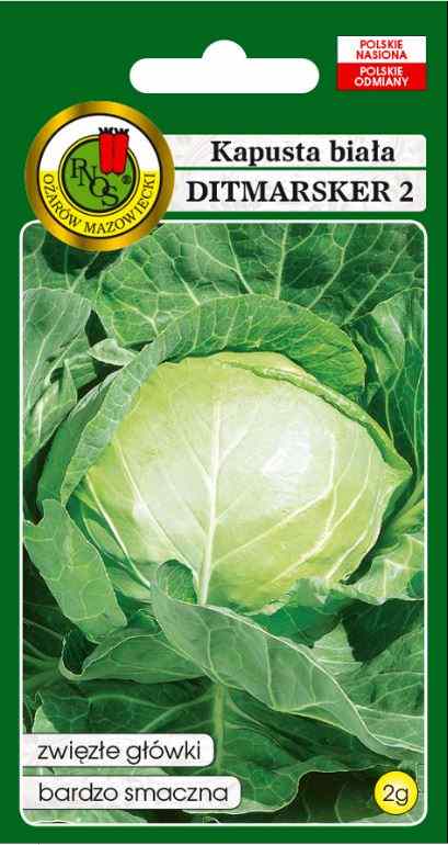 PNOS Kapusta Głowiasta Biała Ditmarska Najwcześniejsza 2g to odmiana bardzo wczesna. Okres wegetacji trwa od 50 do 55 dni. Główki kuliste wychodzą o masie około 1-1,5 kg i są zwięzłe, jasnozielone na niskim głąbie. Kapusta jest bardzo smaczna oraz bogata w wartości odżywcze. Zawiera węglowodany, witaminy C, E, z grupy B oraz aminokwasy. Zalecana do bezpośredniego spożycia. Wymaga gleby zasobnej w próchnice, dostatecznie nawilżonej oraz obficie nawożonej.