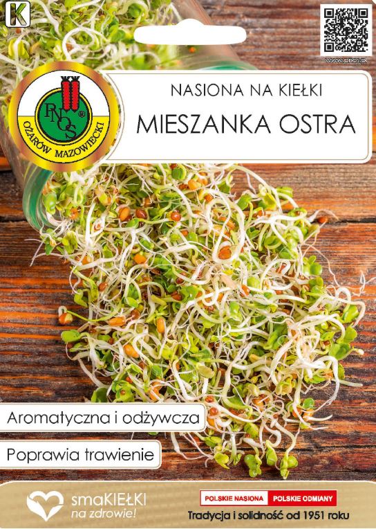 PNOS Kiełki mieszanka ostra to mieszanka, która ma pikantny smak. Kiełki tej mieszanki mają dużo zastosowań, np. do sałatek, kanapek, zup.