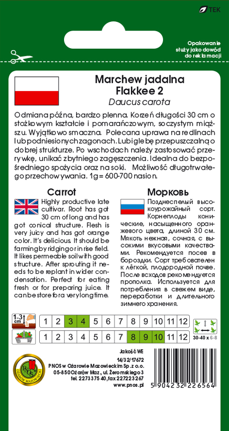 PNOS Marchew Flakke 2 to odmiana bardzo plenna. Korzenie marchwi Flakke osiągają długość 30 cm, są ciemnopomarańczowe.