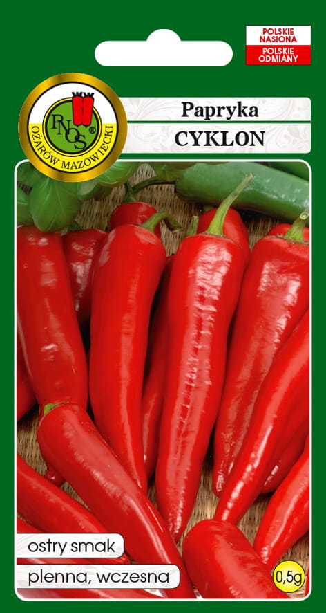 Odmiana wczesna, pierwsze zbioru już w lipcu. Owoce o stożkowatym kształcie długości od 7 do 10cm. Papryka 'Cyklon' wyróżnia się dość duża plennością-z pojedynczej rośliny można uzyskać nawet kilogram owoców (od 25 do 35 sztuk). Szczególnie dobrze smakuje zakonserwowana albo suszona.
