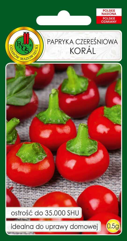 Odmiana 'Koral' to bardzo plenna papryka czereśniowa, charakteryzująca się małymi, kulistymi owocami o średnicy 2–2,5 cm, przypominającymi kształtem i wielkością korale, od których wzięła swoją nazwę. Doskonale sprawdza się w uprawie domowej, zarówno w donicach na balkonie, jak i na tarasie.