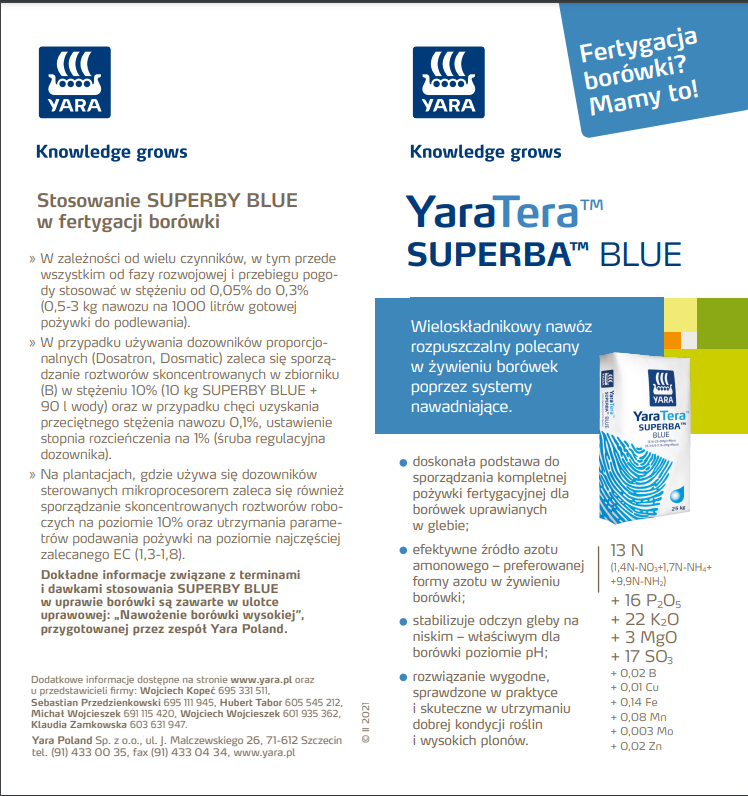 YaraTera Superba Blue Forte to specjalistyczny nawóz profesjonalny pod uprawę borówki amerykańskiej. Wykonany został z wysokiej jakości składników, dobrze rozpuszcza się i działa stabilizująco na odczyn gleby. Polecany jest do stosowania podczas fertygacji, stanowi doskonałą podstawę nawozową do sporządzenia pożywki dla borówki amerykańskiej.