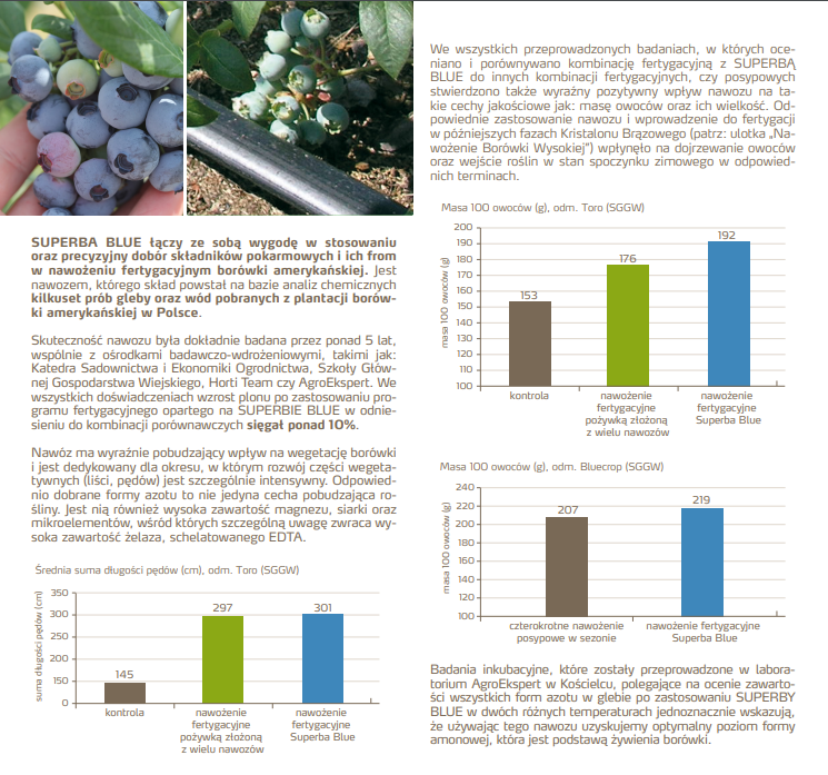 Superba Blue to wygodne i sprawdzone w praktyce rozwiązanie w nawożeniu borówki. Skuteczna w utrzymaniu dobrej kondycji roślin i wysokich plonów. Nawóz ma wyraźnie pobudzający wpływ na wegetację borówki i jest dedykowany dla okresu, w którym rozwój części wegetatywnych (liści, pędów) jest szczególnie intensywny.